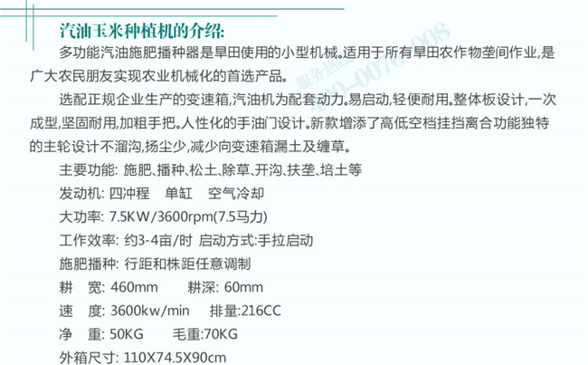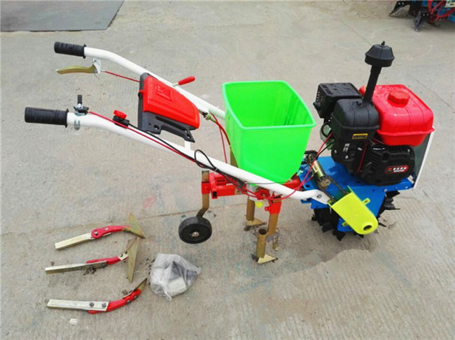 多功能汽油施肥播種器是旱田使用的小型機械。適用于所有旱田農作物壟間作業(yè)。是廣大農民朋友實現農業(yè)機械化的首選產品。    選配正規(guī)企業(yè)生產的變速箱,汽油機為配套動力。易啟動,輕便耐用。整體板設計,一次成型,堅固耐用。加粗手把。人性化的.手油門設計。新款增添了高低空檔掛擋離合功能獨特的主輪設計不溜溝,揚塵少,減少向變速箱漏土及纏草。主要功能:施肥;播種;松土;除草;開溝;扶壟;培土等